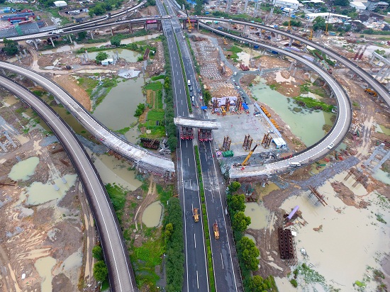 为实现立交既有桥梁安全、快速的拆除,缩短施工时长,减小施工对交通的影响,降低安全风险,企业与中南大学、西南交大组成联合科研攻关小组,对桥梁拆除进行仿真分析和监测监控,确立拆除方案,为桥梁拆除工作提供技术支持;引入用于火箭转场的多轴平板台车并最终确立了智能化组合模块拆除施工工艺(即将横跨沈海高速的整块桥梁进行切割,再将切割后的桥梁移至不影响交通的位置进一步拆除);采用多轴平板运输车顶升运输技术,有效安全的实现了切割后桥梁的运输转移。相关新设备、新技术的应用,互通立交桥2段上跨沈海高速部分的拆除工期,分别从原预计的40、60天缩短到4天内,相比旧式支架拆除的工艺也极大地减小了对沈海高速上每天3万余通行车辆的交通影响。